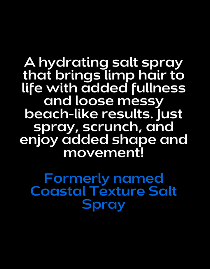 A hydrating salt spray that brings limp hair to life with added fullness and loose messy beach-like results. Just spray, scrunch, and enjoy added shape and movement!