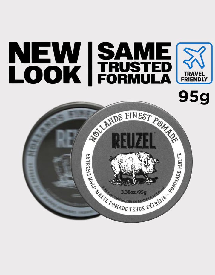 Reuzel Extreme Hold Matte Pomade provides the strongest hold and matte finish.
